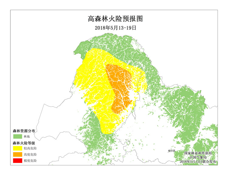 预计未来一周(2018年5月13-19日),内蒙古北部、黑龙江北部地区气温急剧升高且无有效降水,旱情仍将维持,综合气象、林区物候及林火监测情况分析,上述地区森林火险等级为高度危险级别,国家林业和草原局、中国气象局特联合发布高森林火险橙色预警。