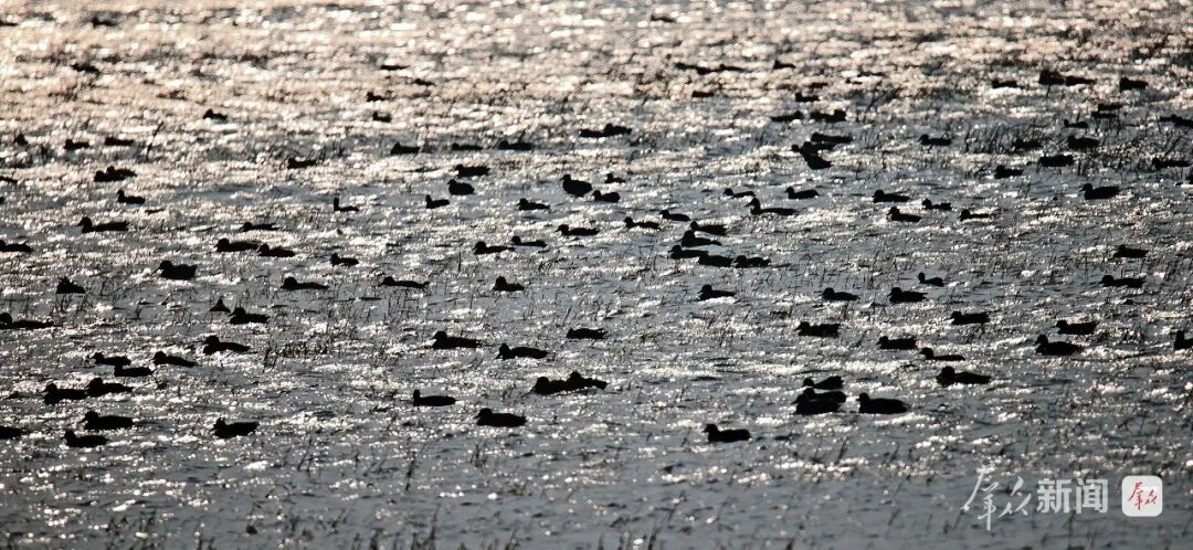 12月13日,陕西黄河湿地省级自然保护区大荔段迎来大批迁徙候鸟,国家一级重点保护鸟类黑鹳、大鸨等上万只水鸟齐聚于此,扎堆栖息,上演了一场热闹非凡的“万鸟赶大集”生态盛景。