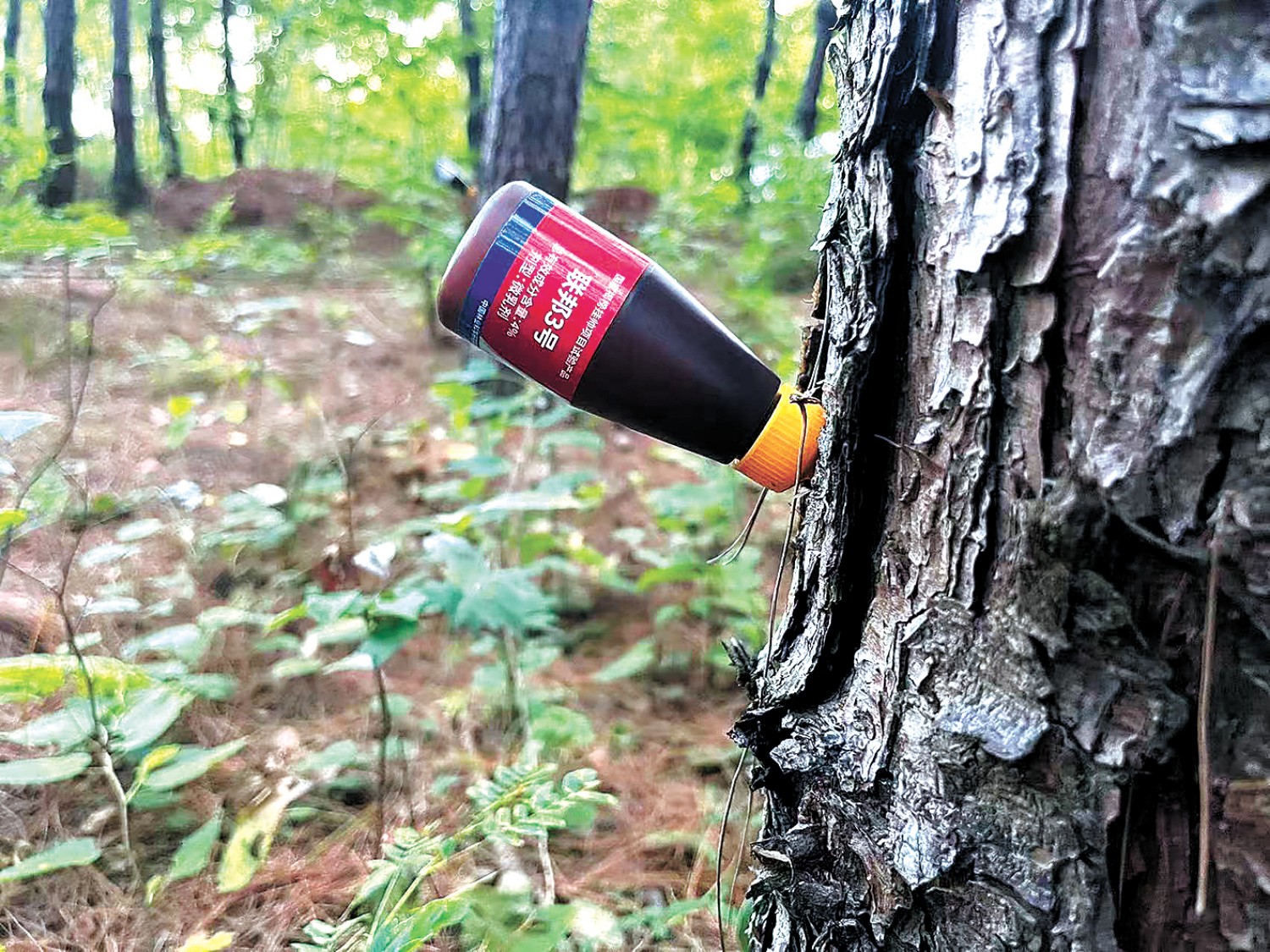 团队研发了疫木热处理工艺。对原木直接加热,使原木芯部温度快速达到65℃以上,确保疫木病害灭杀率达100%。该技术产品具有可移动、低能耗、无有害排放等特点,提升了疫木使用价值。另外,利用疫木经高温干馏、冷凝、沉淀、过滤、萃取等工艺,制成疫木源小分子疫苗,配合高效防控药剂使用,可显著增强药效、降低防控成本,为构建可持续防控体系提供了路径。