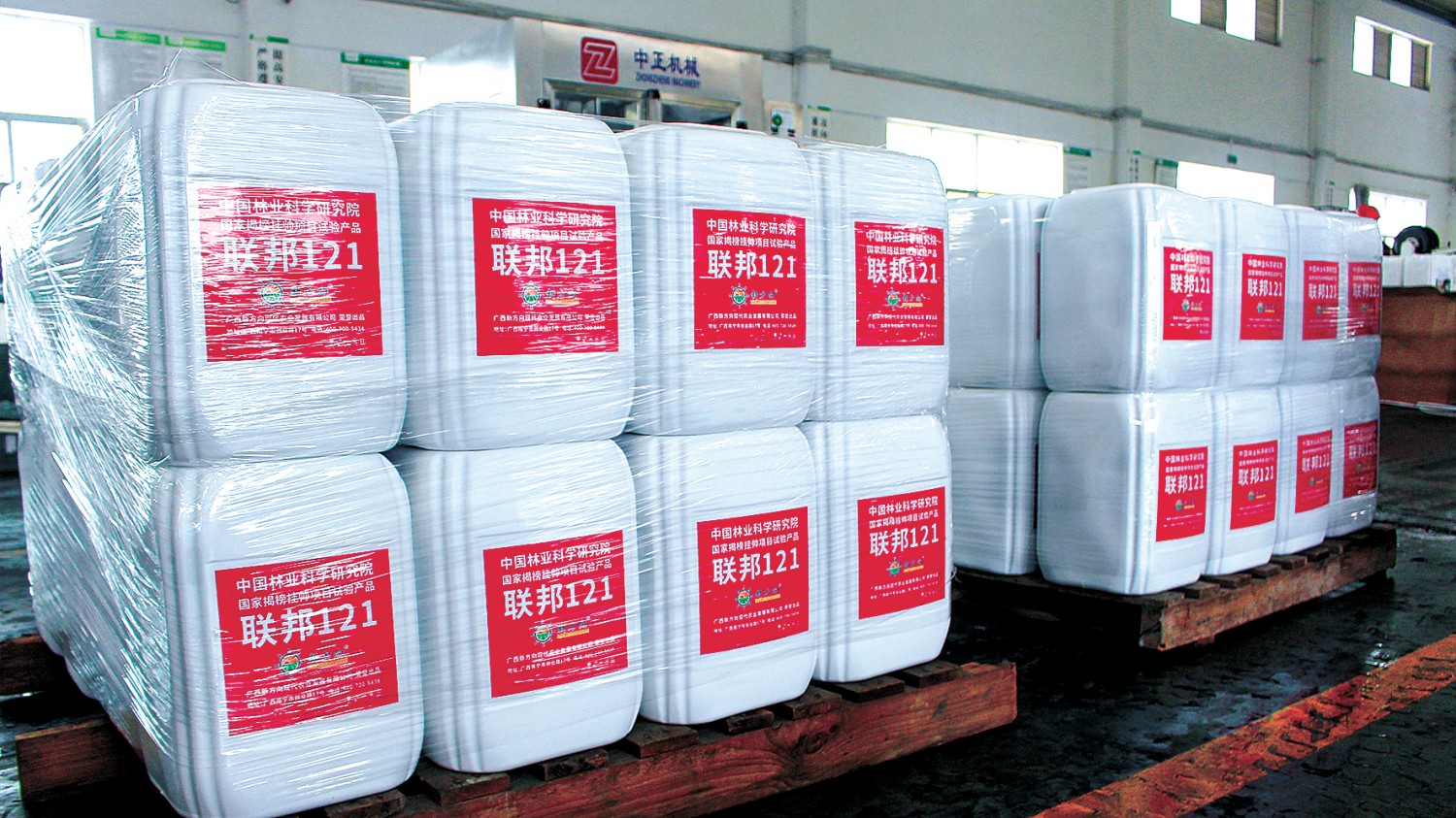 其次,使用可航空喷洒的药剂。松材线虫病大面积发生的地区,很难完成全面的树干注射。项目组研发了新型绿色航空喷洒预防性制剂联邦121可湿性粉剂和应急防控航空喷洒药剂联邦1号悬浮剂。联邦121是新型绿色预防性制剂,具有无污染、持效期长、不易产生抗药性等特点。联邦1号是新型飞防化学制剂,药液可有效在小枝、茎、叶表面附着、吸收,提高了药剂的持效期。