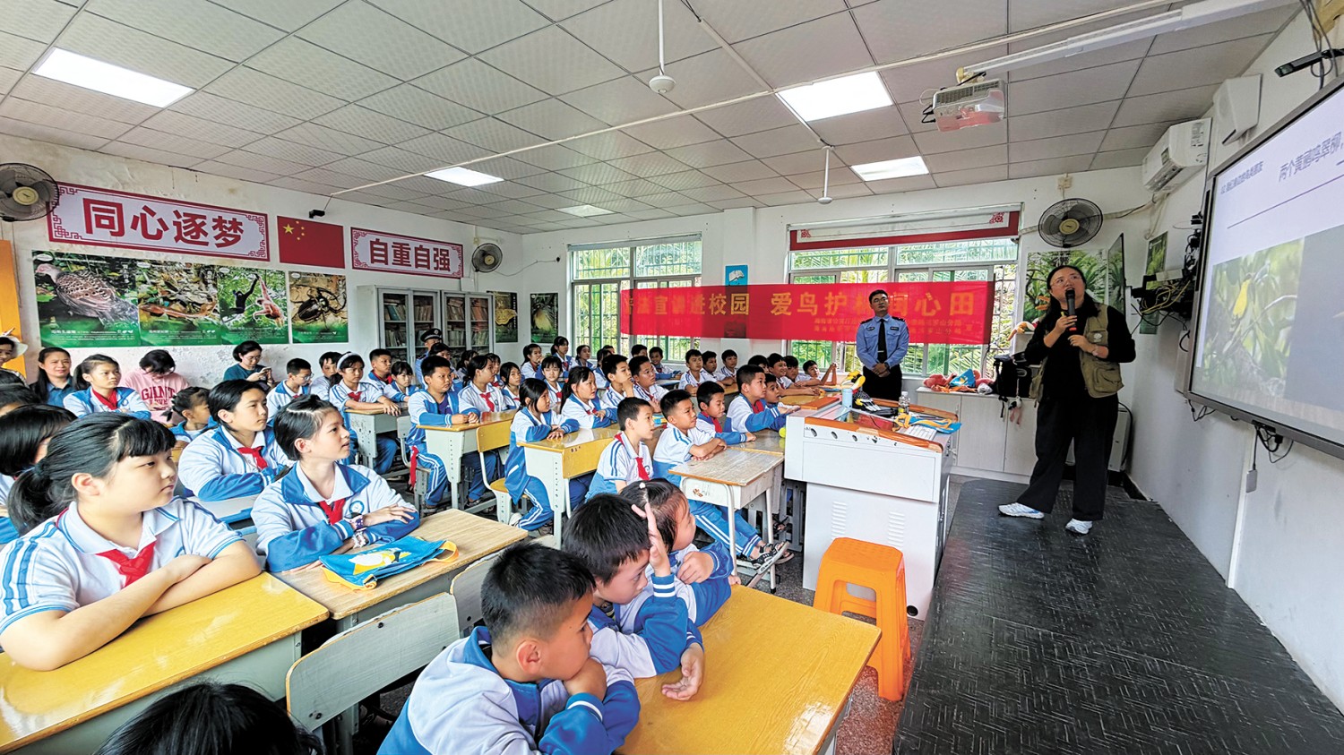 自然讲师和警察为吊罗山学校的学生们讲解鸟类保护知识 张萌摄